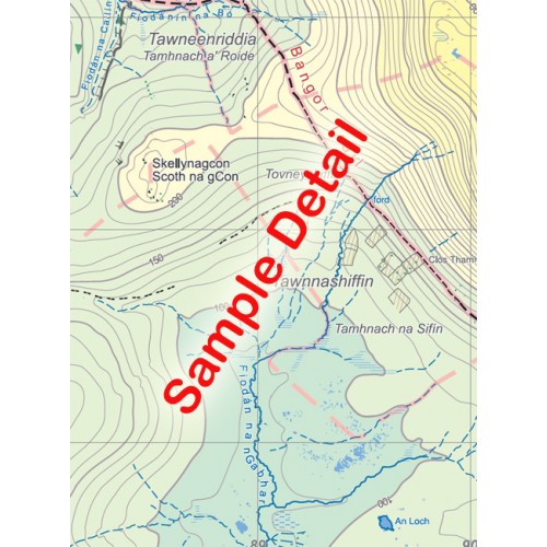 This map centres on the area dedicated to the Wild Nephin Wilderness Area. Where the Ordnance Survey Discovery takes four maps (Sheets 22, 23, 30 and 31) to cover this area, this map covers the 650 sq km of land on one sheet at a scale of 1:25,000. The map is printed on 100 gsm Enduro paper, which is water and tear resistant. There is a 3km overlap between the two maps printed on both sides of the sheet.