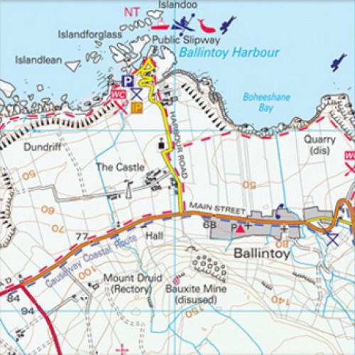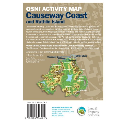 The OSNI Causeway Coast and Rathlin Island Activity Map provides a guide to the spectacular northern coastline, covering many of Northern Ireland's better known tourist attractions, from Magilligan Point to Torr Head and Rathlin Island. Designed for outdoor enthusiasts, the map shows features such as waymarked walks, surfing beaches and canoe trail access points. As well as the Giant's Causeway, it shows the route of the International North West 200 Motorcycle Road Race, and enables visitors to explore Rathlin Island, home of Northern Ireland's biggest seabird colony.